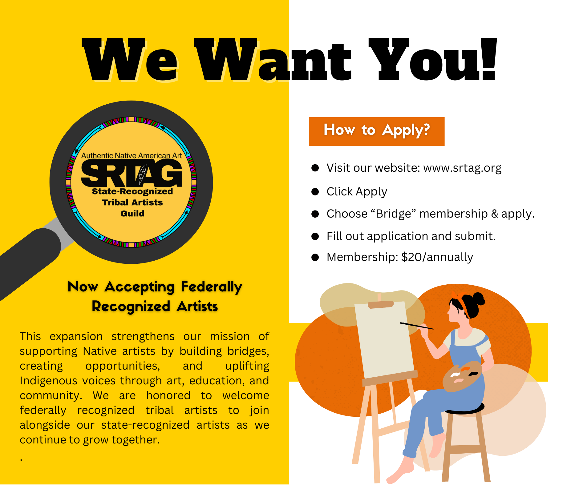 SRTAG is proud to welcome federally recognized tribal artists into our Guild. This invitation reflects our continued commitment to building strong, respectful collaborations that uplift Native artists and strengthen understanding of the Indian Arts and Crafts Act. By bringing together official state-recognized and federally recognized tribal artists, we create opportunities for shared learning, advocacy, and mutual support. Membership in SRTAG provides artists with increased visibility, access to professional resources, networking opportunities, and a collective voice dedicated to protecting authenticity in Native art. Together, we are building a stronger, more inclusive artistic community that benefits artists, tribes, and the public alike.